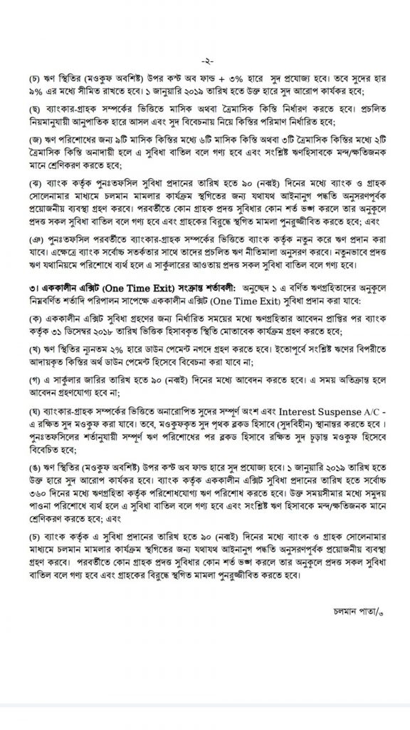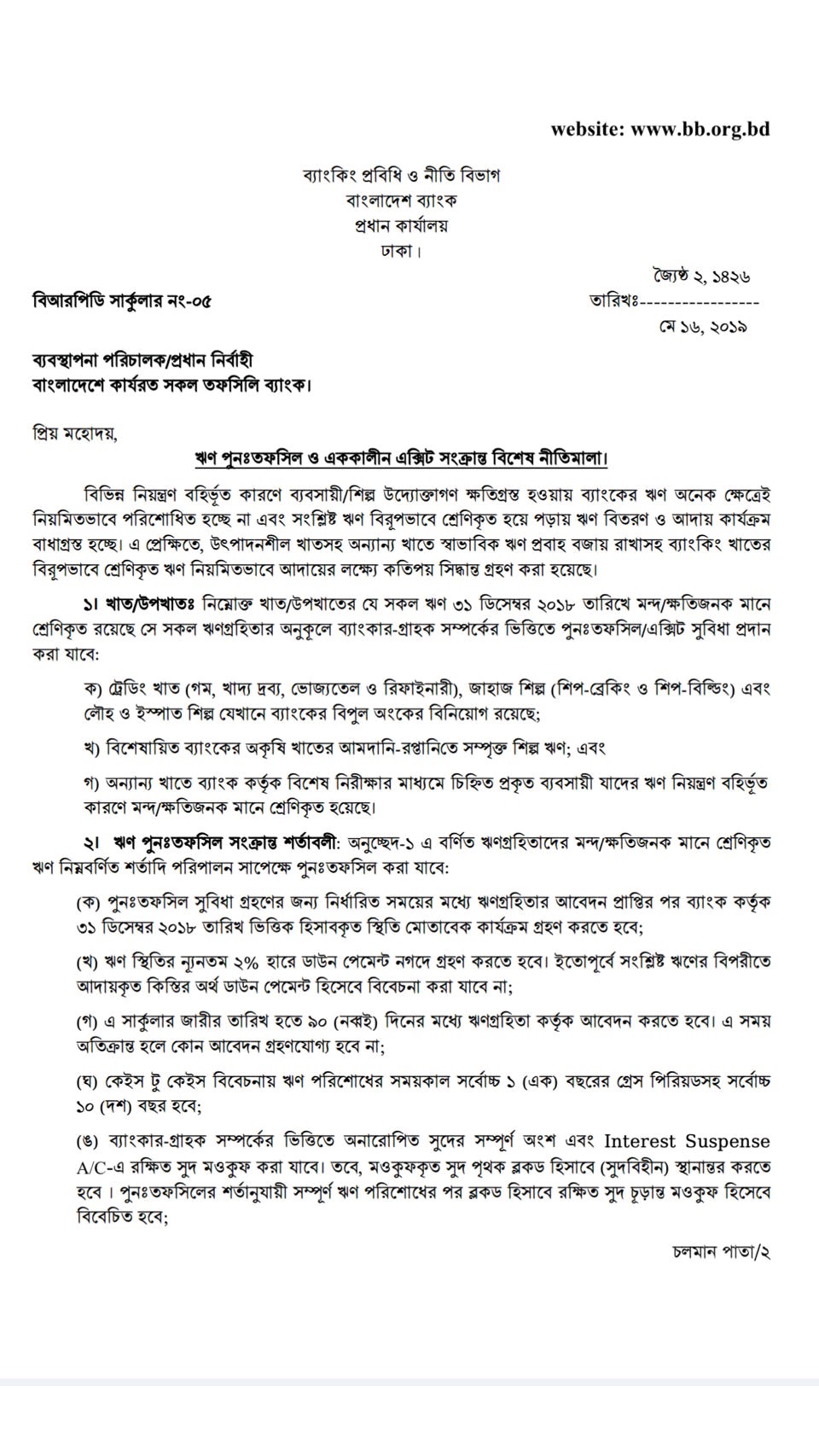 Bangladesh Bank vide its circular dated 16th May, 2019 has created a scope for rescheduling of classified loans subject to 2% down payment. Loans in the essential commodity trading, ship breaking and steel industries are eligible to apply within 90 days of issuance of the circular.