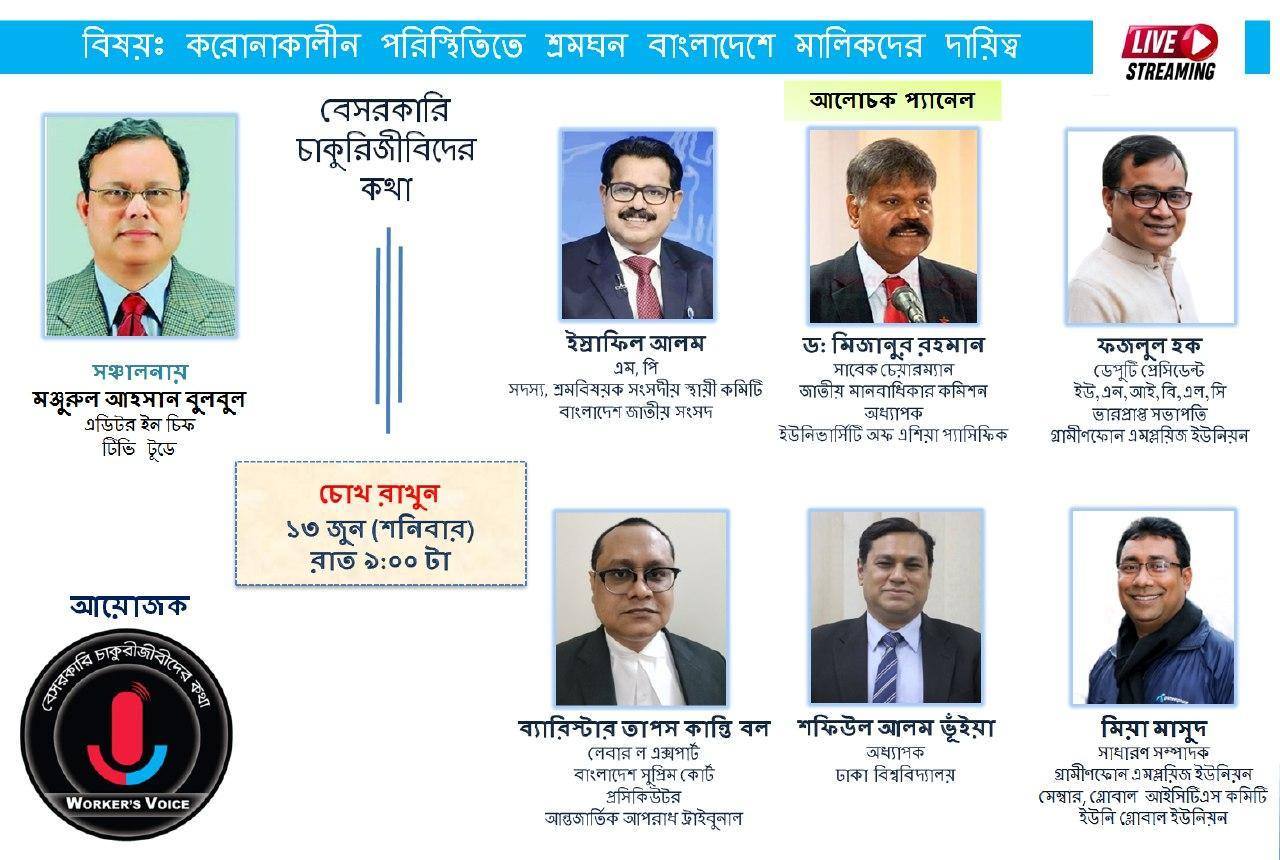 করোনাকালীন শ্রমঘন বাংলাদেশে দ্বায়িত্বশীল মালিকদের ভূমিকা শিরনামে আগামী ১৩ই জুন ২০২০ তারিখে Workers Voice bd থেকে একটি ওয়েবেনারের আয়োজন করা হয়েছে। যেখানে আমাদের চেম্বার প্রধান ব্যারিস্টার তাপস কান্তি বল শ্রম আইন বিষয়ে তার বিশেষজ্ঞ মতামত প্রদান করবেন।