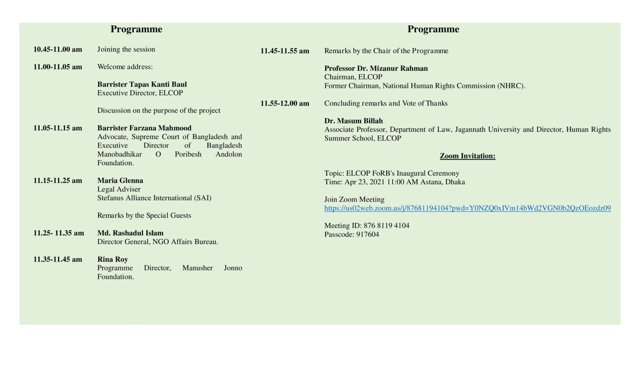 It is a pleasure to inform you that ELCOP is going to organize an online training on Capacity building for lawyers on national Freedom of Religion or Belief (FoRB) remedies, which is funded by Stefanus Alliance (SAI).The objective of this training is to connect a network between lawyers, academics and activists and to strengthen access to justice for victims of FoRB violations by equipping and supporting lawyers, human rights organizations and faith-based actors to promote FoRB and defend victims. The inauguration of the training will take place on 23rd April, 2021 at 10 am. The program will take place virtually on Zoom. Dr. Mizanur Rahman, Chairman, ELCOP and former Chairman, National Human Rights Commission (NHRC) has kindly consented to grace the occasion as Chief Guest. Md. Rashadul Islam, Director General, NGO Affairs Bureau and Rina Roy, Programme Director, Manusher Jonno Foundation have consented to join the program as Special Guests. Barrister Farzana Mahmood, Advocate, Supreme Court of Bangladesh and Executive Director of Bangladesh Manobadhikar O Poribesh Andolon Foundation will give light on the purpose of the project. The whole program will be presided by Barrister Tapas Kanti Baul, Executive Director, ELCOP. Last of all, Dr. Masum Billah, Associate Professor, Department of Law, Jagannath University, will propose the vote of thanks.